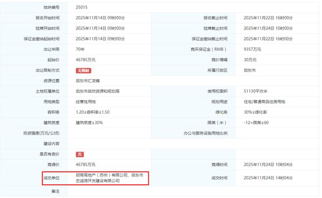 如今,南通土地市场正在蓬勃发展。五块优质住宅地块一次性成功拍卖。交易总金额突破26亿,引发市场关注!其中,最引人注目的是央企蛇口首次落户启东。它将联合当地国企为启东带来前所未有的第四代产品,标志着启东住宅区正式进入新时代!中国国有富商蛇口与启东的长子就居住在本次蝴蝶湖土地拍卖的“明星地块”——启东25015号地块。毫无悬念地,由招商蛇口启胜集团(即招商地产(苏州)有限公司和启东中信开发建设有限公司)联合夺得。成交总价约4.68亿元,成交底价约6100元/平方米。为什么这片土地如此受欢迎?第一个 en实力地产企业的尝试:这是华商蛇口首次进入启东市场。作为稳健国企的代表,招商蛇口的到来不仅充分认可了启东市的发展潜力,更以强大的品牌力和产品力壮大了该地区的房地产市场。产品换代即将到来:根据中国贸易商蛇口发布的信息,该项目将是首个“第四代启东”。这不再是地面新闻。早在今年3月,招商蛇口就与市政府签署了合作框架协议,推动这一优质住宅项目的落地。此时征地成功,意味着承诺正式兑现!主地优质位置:地块位置堪称“炸弹王”。离Mun很近启东市人民政府.周边有叠湖中学、城南小学、启东吾悦广场、蝴蝶湖公园、希尔顿酒店等优质教育、商业、生态、休闲设施。舒适的生活和高端的环境是相辅相成的。作为城市运营专家,中国蛇口商人深耕南通多年,打造了众多标杆项目。例如,在城市主城区,有望出现滨江商贩,重新定义滨江奢华特色的生活方式。此外,在创新区等区域,还有招商公园大道、圆融花园、紫园等高端开发重磅布局。中国蛇口商人的一举一动,都致力于以优质产品推动区域城市更新。此时入驻启东,是其深化南通战略的又一重要里程碑。快速过温其他地块点评:通州市场同步发展。除了启东的重点地块外,通州区也有不少优质地块在售,可见市场的活跃程度。通州金新街R2025-015地块:南通润顺置业有限公司竞得,楼面价约8500元/㎡,容积率1.5-1.7。该地块位于快速发展的金沙湾地区,毗邻文山初级中学和通州高中。另有金沙湾医院、体育中心等配套设施,潜在价值巨大。规划显示,该块土地上不得建设三层及以上住宅,不得建设带私家花园的低层独立屋。通州川江地段连续三拍:R2025-016、017、018均被当地某国企(南通神汇地产)拍得南通新汇控股集团),楼面价均为6750元/平方米。这三块地块均位于川江镇,毗邻中国叠石桥国际家纺城。依靠强大的工业人口基础,他们将是未来的焦点。家纺产业园提供必要的居住设施。豪宾本土豪宾拍卖不仅是南通房地产市场稳定发展的一个缩影,也展现出新的信号:一方面,实力央企尤其是华商蛇口凭借创新产品进军县级城市的持仓不断加码,显示出看好整个南通地区的价值,将产品竞争推向新的台阶。另一方面,重点行业、产业重点区域地块受到青睐,表明市场正在精准寻找需求旺盛的区域,为未来发展奠定基础。r 未来的住房供应。华商蛇口将为启东的“宅四代”带来怎样的惊喜?让我们一起期待吧!编辑:星姐 主编:智儿 -本文为原创 -
