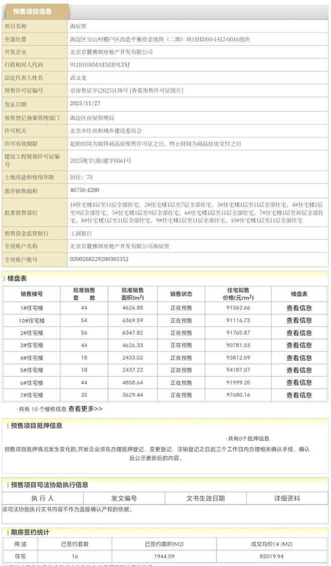 北京金申严明辉开盘两周后,海淀宝山“双胞胎”项目之一的中国网上建设数据签约一品海辰远景已正式披露。截至12月14日,该项目已网上签约16套,签约总面积1944.09㎡;成交均价约8.5万元/㎡,成交总金额达1.65亿元。相比隔壁的北京御海逸,目前网上签约有5套,成交均价约8.73万元/㎡,海辰远景单价略便宜。 6月5日,中建一品以27.78亿元中标海淀区宝山村乡镇重建平衡基金(二期)第二类城镇住房HD00-1412-0016。楼面价约人民币55,100元/㎡,溢价率为1.76%。 8月29日,海岛规划设计方案陈远景项目公布。项目用地面积约2.4公顷,总建筑面积约8.01万平方米,其中地上建筑面积约5.04万平方米,地下建筑面积约2.97万平方米,容积率2.1。项目规划建设7-11层纯平房11栋,共414户,平均面积123平方米。王楼层高3.1米,其余建筑高约3米。主要户型包括99平米、107平米三房户型,123平米、139平米、181平米四房户型,以及少量70平米、80平米、90平米上下层户型。户型拥有270°景观巨屏、赛维LDK一体化布局,客房可用率为87%-93%。最小户型99㎡,主力户型140㎡以内,定位中档改善;少数大型单位被认为是高端功能。至99平米套间总价约800万元起,主力户型总价区间为1000万-1500万元,填补了区域改善空白,瞄准置换客户。该项目位于海淀区四季青镇西南部,西四环与五环之间。南侧毗邻富士路,北侧距地铁六号线廖公庄站约700米。紧邻地铁1号线、BRT城市快线以及富士路、西四环等主要道路。项目配套西侧为石景山泸沽地块,东南侧为五棵松地块。东区城市界面一般。商业设施有五棵松万达广场、华熙生活、世纪金源、山姆会员店、北京西大悦城等;医疗设施包括北京朝阳医院、航天中心附属医院与首都医科大学合作;教育设施有青苗学校海淀校区、海淀外国语实验学校。海辰远景与北京宇·海老被称为宝山“双胞胎”楼盘,自拿地以来就形成了竞争关系。随着两个项目的签约网上数据一一放出,两者在海淀西部楼市的竞争开始了。