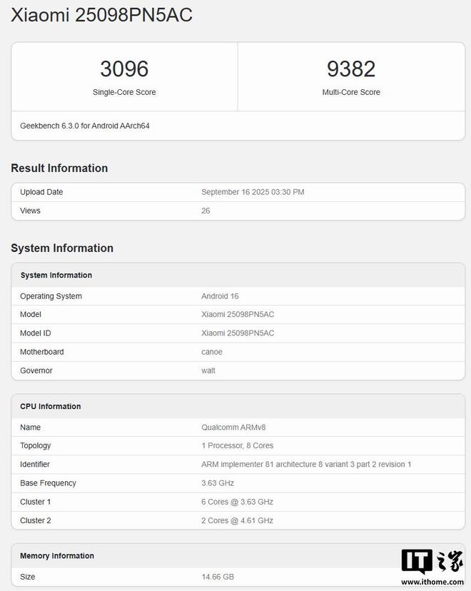 据9月17日的Home称,昨天的Geekbench数据库中出现了两次运行的小米17 Pro(25098PN5AC),这可能是由媒体评论的在线运营操作引起的。该手机配备了第五代高通Snapdragon 8 Supreme Edition Soc,配备了2 4.61GHz超大核心,6 3.63GHz大核心和Adreno 840 GPU,具有1.2 GHz的集成。此外,手机配备了16GB的内存,并基于Android 16的彭台OS系统进行了预安装。由于运行标记样本非常小且不确定,因此我们不会在这里进行比较。 Home指出,小米17系列已于8月27日早些时候批准为3C认证,这三种型号为25098PN5AC,2509FPN0BC和25113PN0EC。根据认证信息,小米17具有100W有线闪光充电标准。